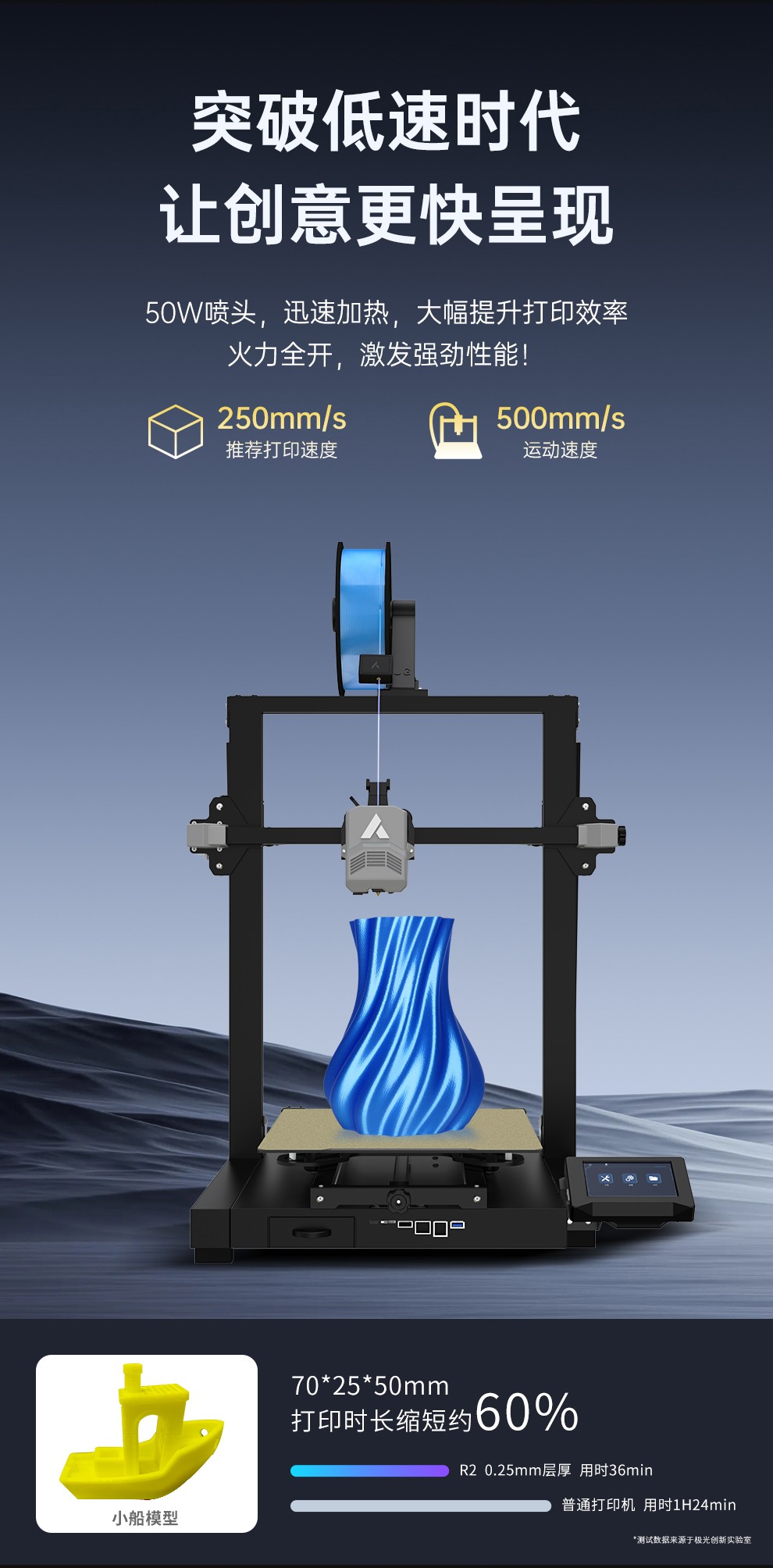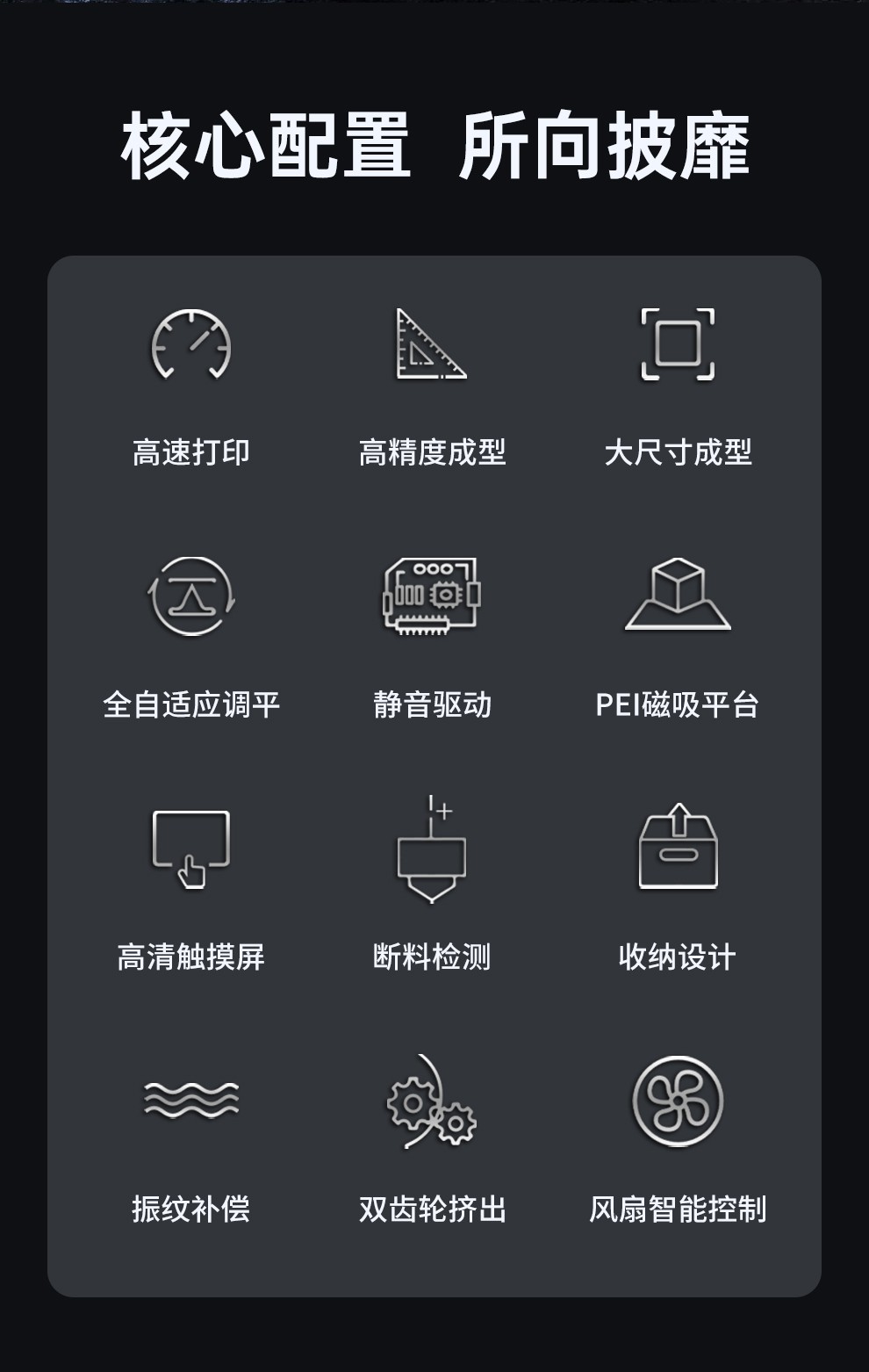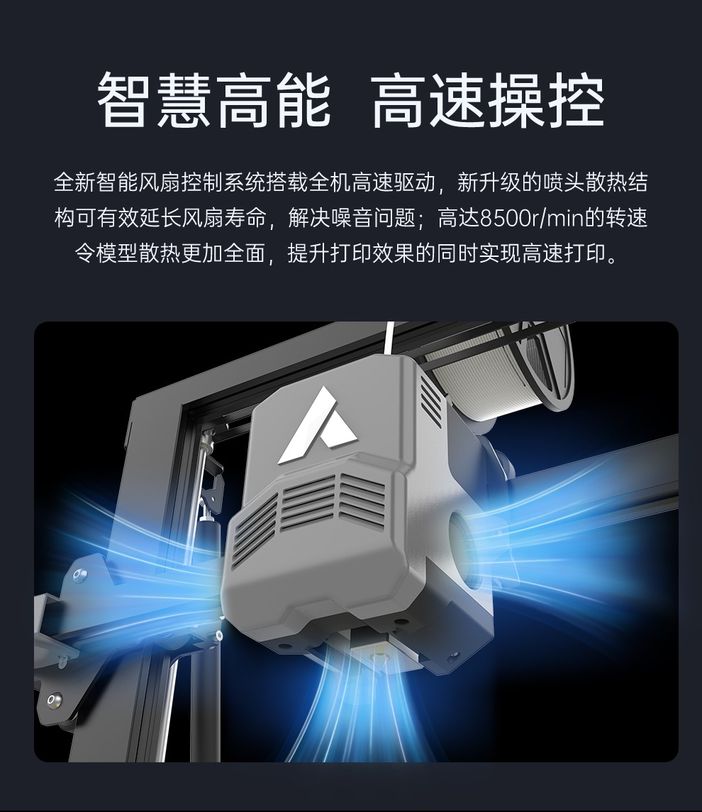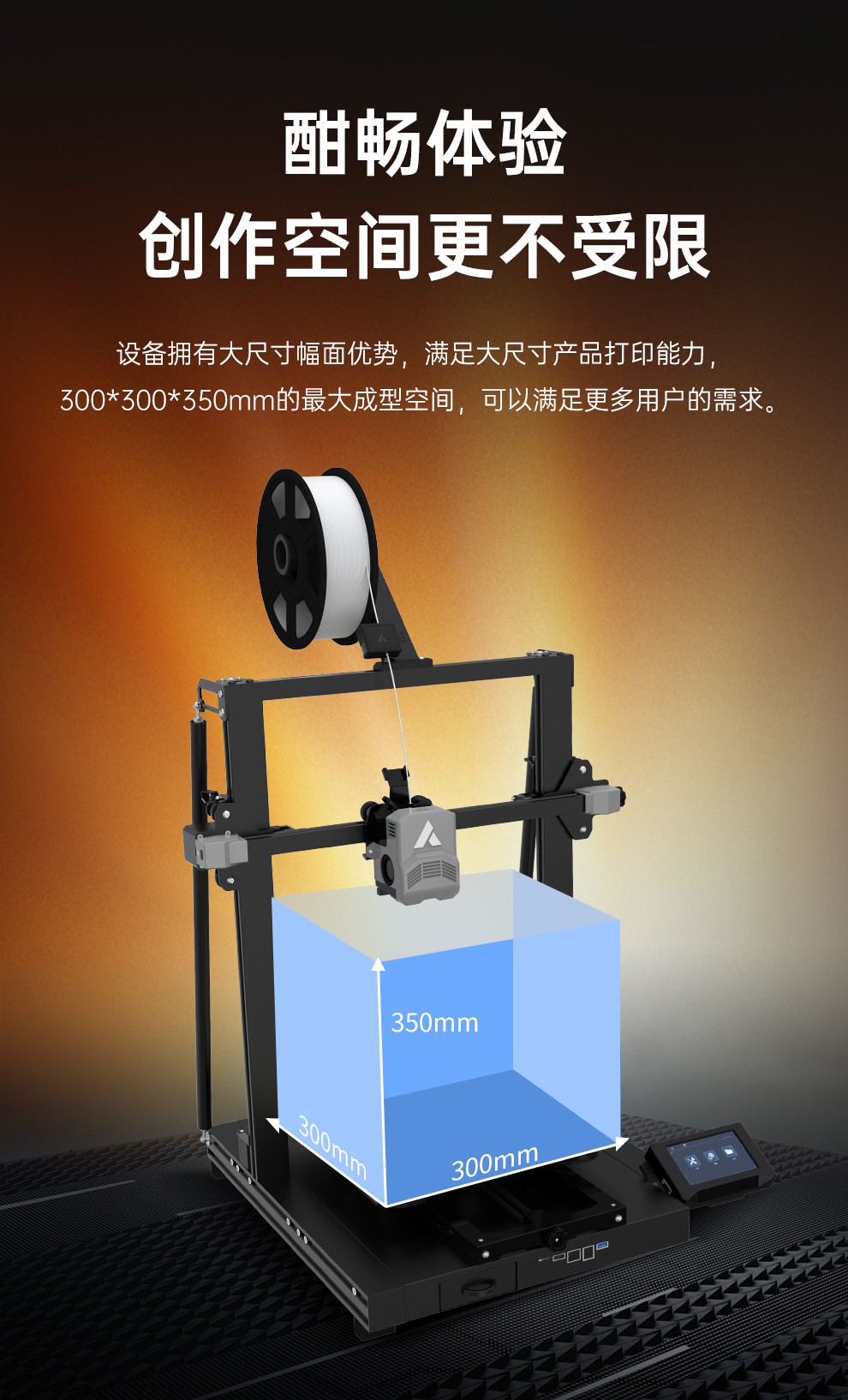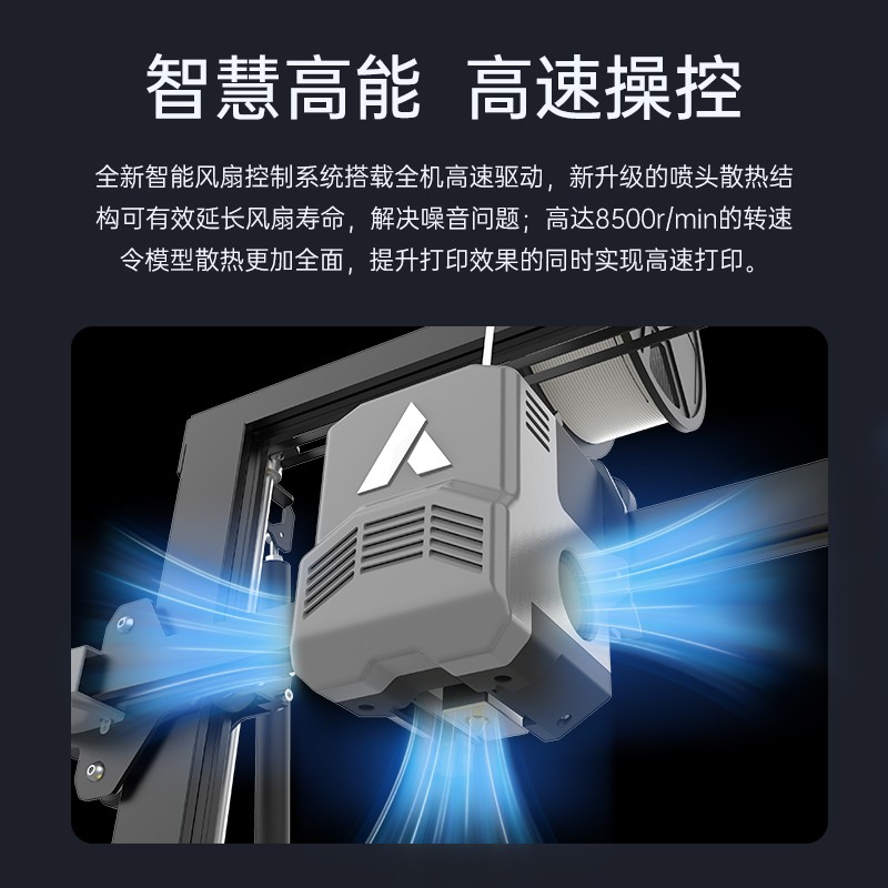 300*300*350mm最大成型空間·9.5倍放大擠出,使出料更均勻,成型更出色,搭載智能風(fēng)扇控制系統(tǒng),讓高達(dá)8500r/min的轉(zhuǎn)速降低噪音,還可以模型散熱更全面的同時(shí)高速打印