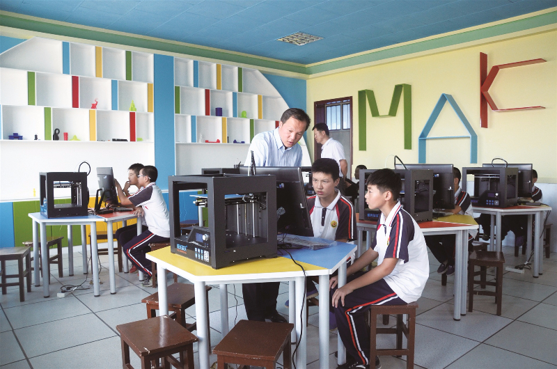 目前,“3D飛天創(chuàng)客空間”正式建成并投入使用。學(xué)生通過專業(yè)的中小學(xué)建模軟件,自己動手設(shè)計3D模型,運(yùn)用3D打印機(jī)打印出茶杯、筆筒等實物,讓學(xué)生的想象變?yōu)楝F(xiàn)實。此外,在歷史、生物、地理、化學(xué)、物理等課程的教學(xué)中,輔助教具都可以通過3D打印制作出來,將抽象、難懂的教學(xué)變得直觀形象化,更好地激發(fā)學(xué)生的學(xué)習(xí)興趣。